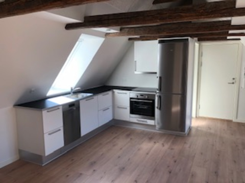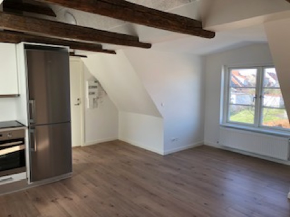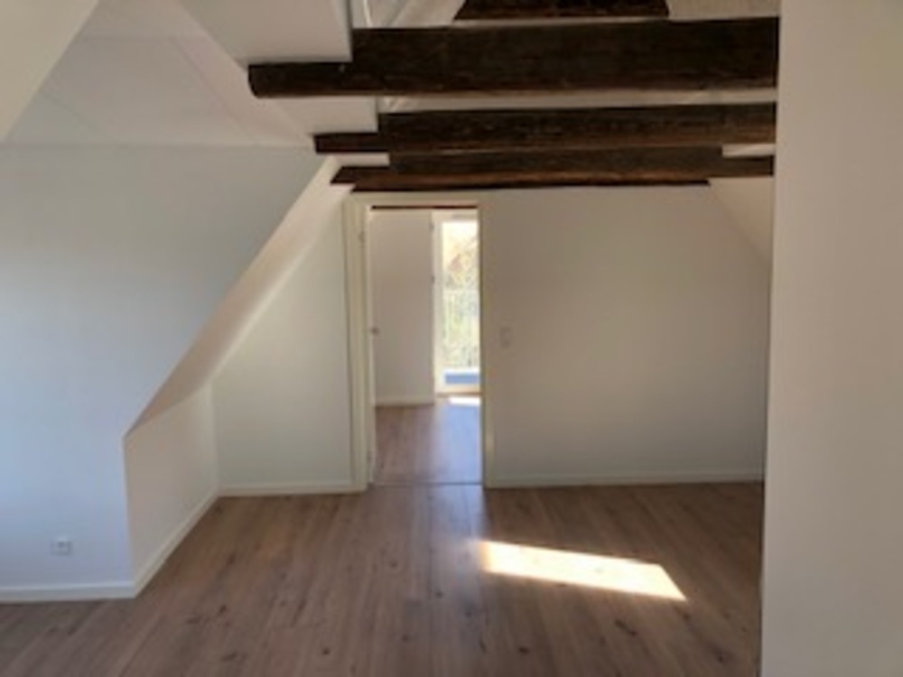 Flot og lys lejlighed med synlige bjælker.
